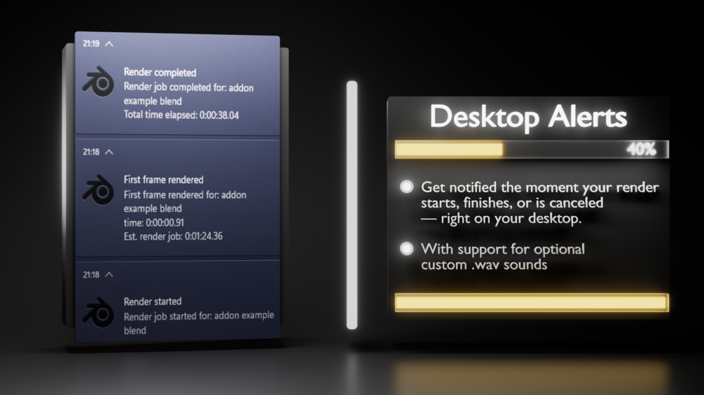 Whether you’re rendering stills or long animations, this add-on gives you peace of mind without constantly checking Blender.